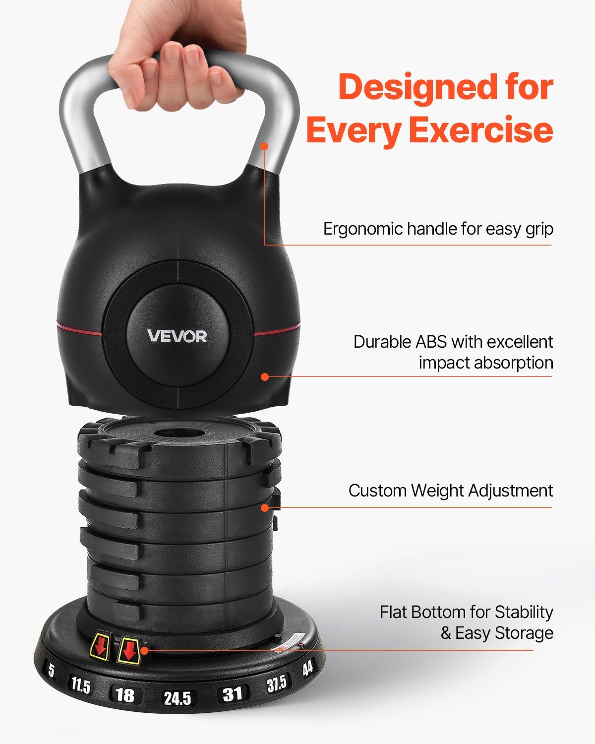 VEVOR Kettlebell, Adjustable Kettlebell with 7 Weight Levels (5, 11.5, 18, 24.5, 31, 37.5, 44 lbs), Die-Cast Aluminum and ABS Material