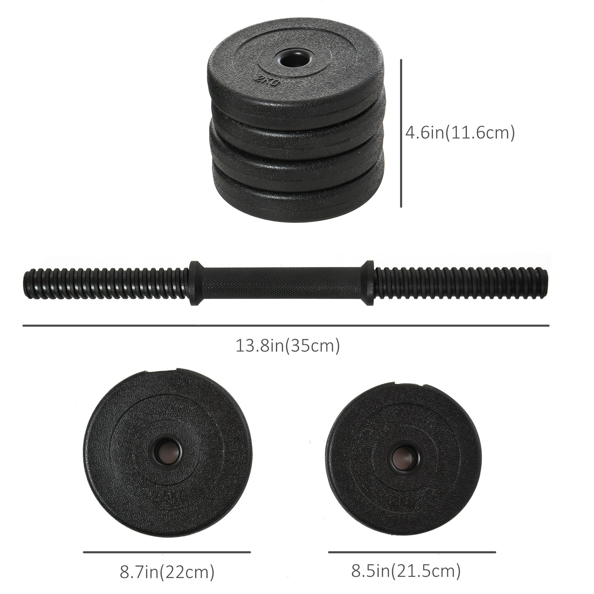 • Hand Weights Set Dimensions: 2 x 1kg (2.2lbs) Dumbbell steel bar with plastic covering (Diameter: 1" Length: 13.75"); 4 x 5.5lb, Weights (8.4" L x 1.5" D); 4 x 4.4lb, Weights (8.7" L x1.6" D); 4 x lock; 4 x 4.4lbs weights + 4 x 5.5lbs weights + 2 x 2.2lbs dumbbell steel bar = 44lbs in total
