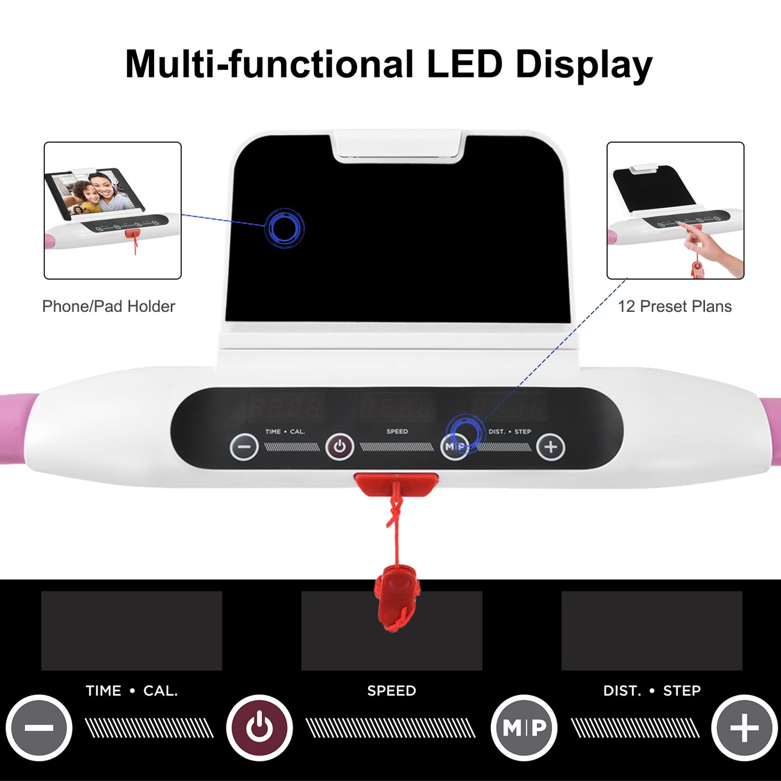 6. 12 Preset Training Plans & Safety Emergency: To burn calories more effectively; we specially programmed 12 different running setting; with the help of these preset training plans; you can choose the best plan to suits your need. A safety key with a clip connects you with treadmill; stops it immediately in an emergency; and protects you during exercise.