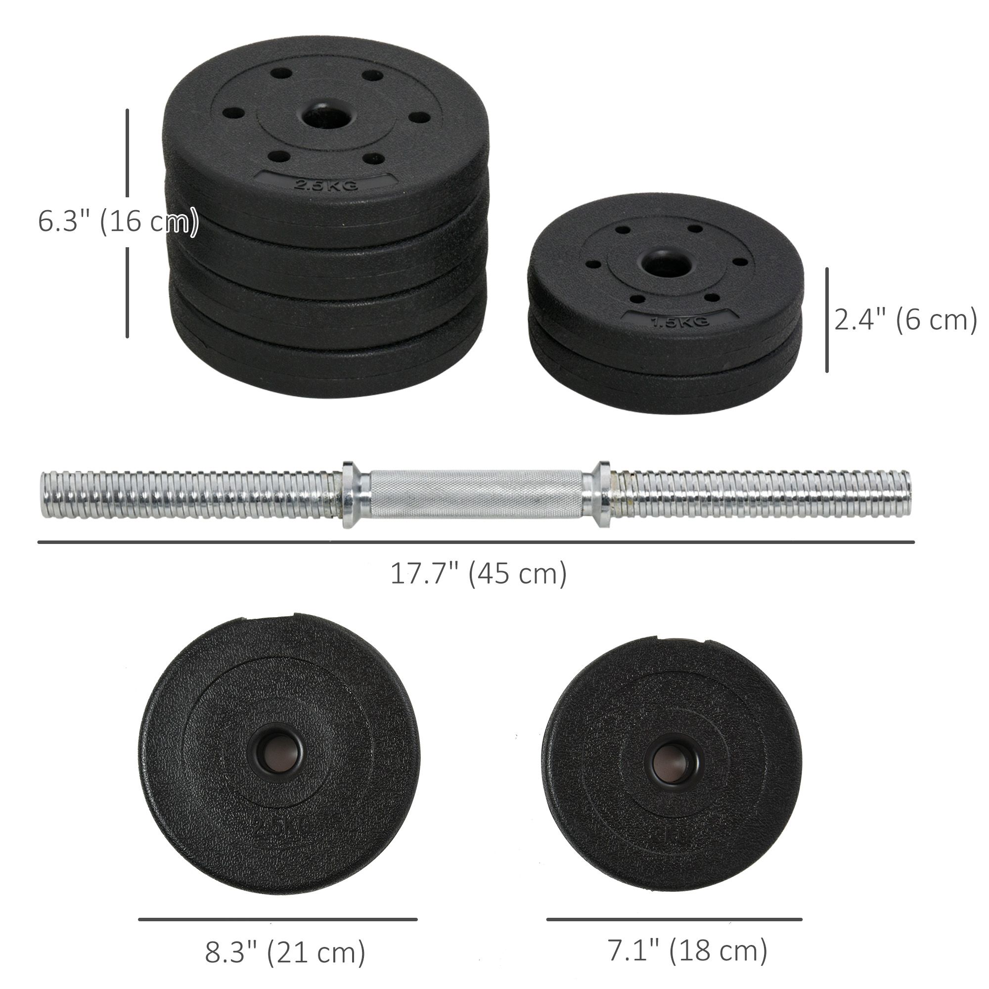 • Dimensions: Overall Dimension: 16.9" L x 7.1" W x 3" H (43 x 18 x 7.5 cm). 2.5kg Dumbbell Dimension: 8.3" Dia. x 1.6" T (21 Dia. x 4 cm). 1.5kg Dumbbell: 7.1" Dia. x 1.2" T (18 Dia. x 3 cm)